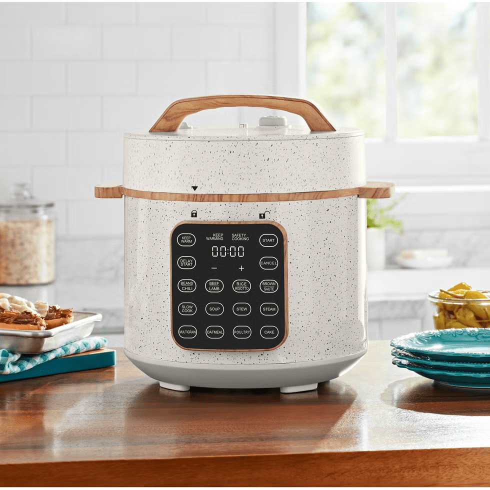 So I tried out her pressure cooker and absolutely fell in love with it. I bought my own the very next day! I snagged the Pioneer Woman brand from Walmart. It was only $59 and so stunning! The cream color with speckles is so gorgeous on a kitchen counter.